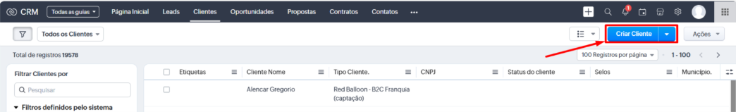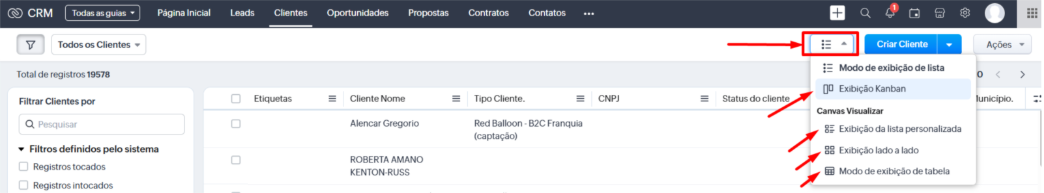 Clique no ícone Visualização de Registros ao lado do botão Criar Cliente para escolher a melhor forma de visualização (Kanban, etc)