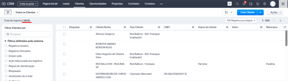Utilize os filtros à esquerda para pesquisar campos específicos, como nome, tipo de cliente, município, estado, entre outros.