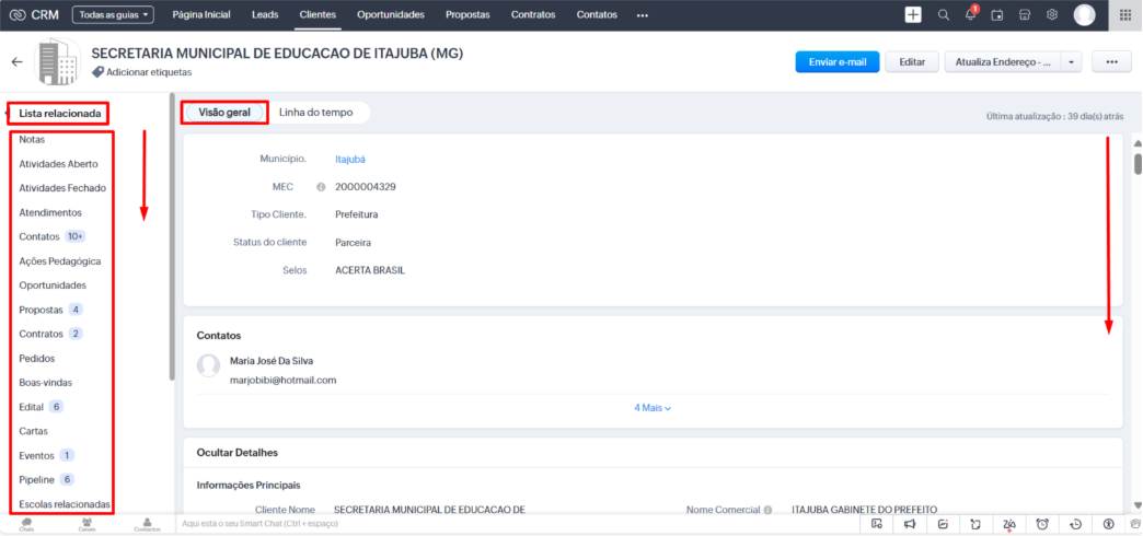 No menu lateral, encontre a lista relacionada com campos importantes como notas, anexos, contatos, contratos em aberto, pedidos, entre outros.